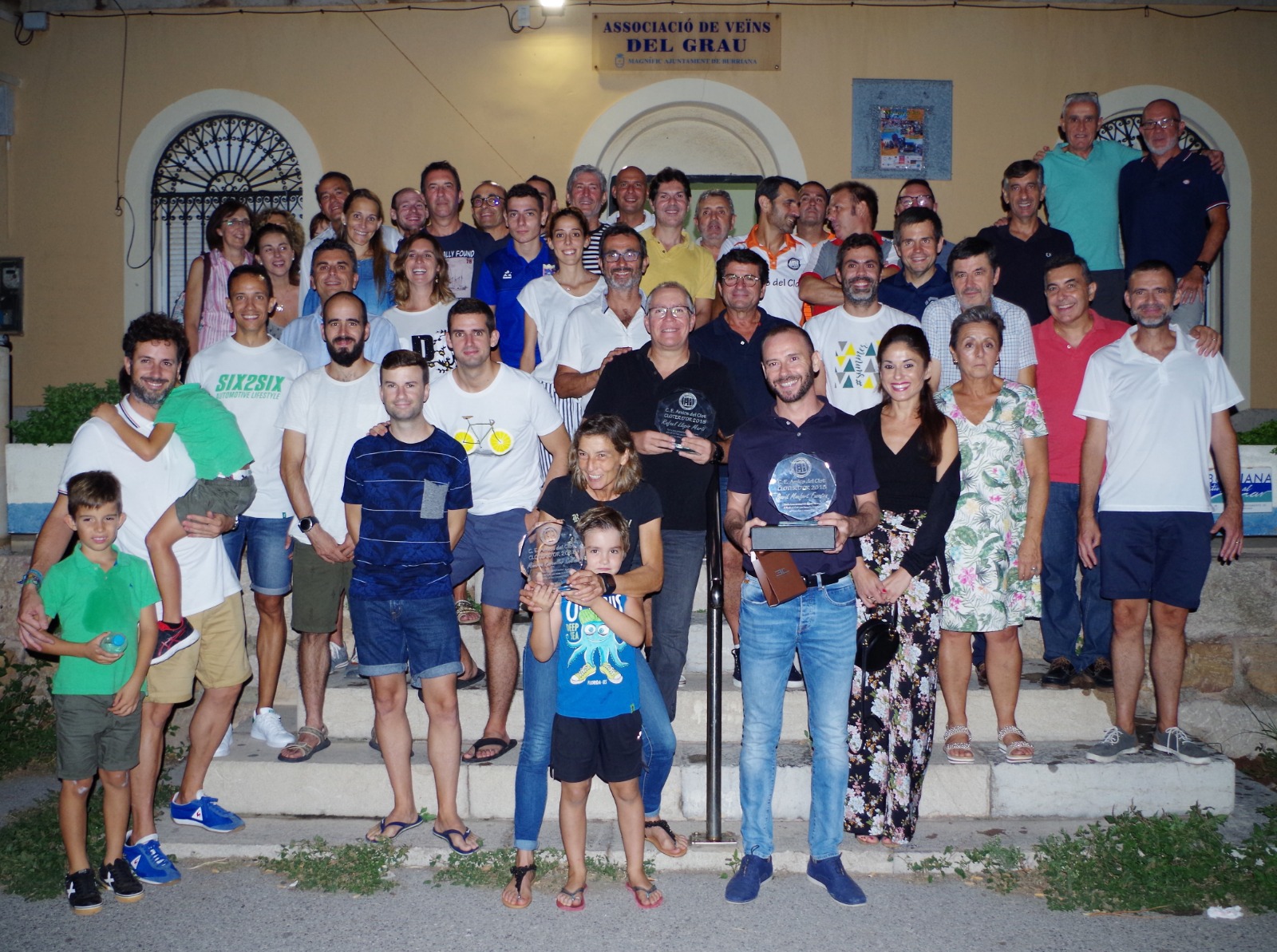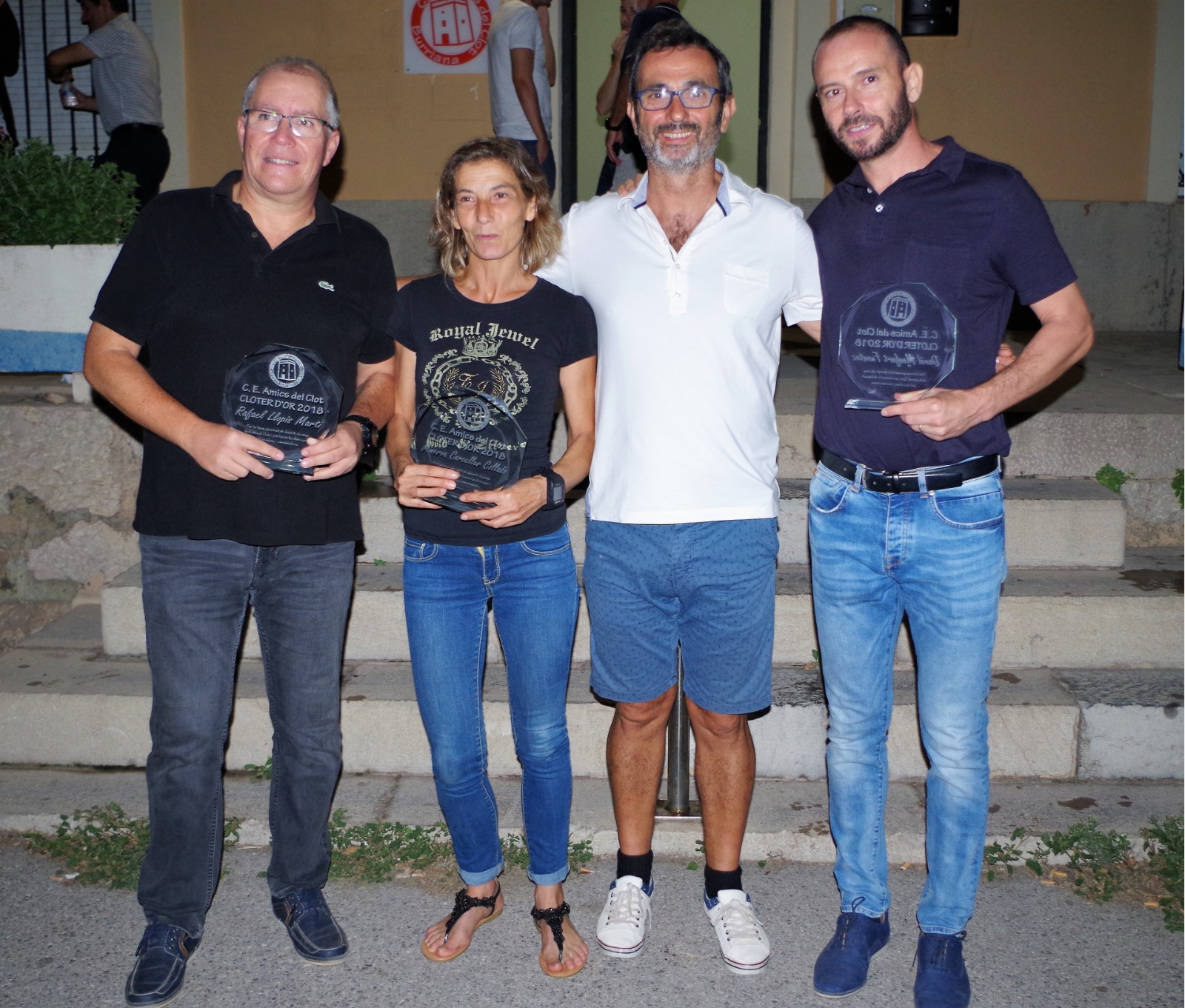 Més enllà de la placa i el clauer, estic convençut que lo que més il·lusió els farà als nostres guardonats es tindre una fotografia del dia de hui, junt amb tots els membres del Club que ens hem reunit. Així que, encara que veig que esteu molt a gust en les cadires, vaig a demanar-vos que vos alceu i ens farem una fotografia en l’escala de l’entrada junt amb els Cloters d’Or 2018.